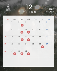 ラターナネルボスコ12月営業日のご案内 お知らせラターナネルボスコ 2025.12.01 12月営業日のご案内です 定休日2.9.10.16.17.29.30.31 店休日27 23日は特別営業です😊 年末年始12月29日〜1月6日までお休みいただいております。